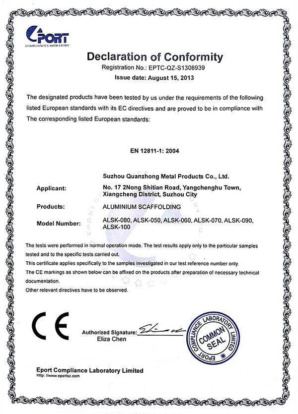 世界杯开户平台-官方入口专注铝合金制品的开发“产品就是人品”的企业理念,不断进行技术创新、设备创新、服务创新、和管理方式创新来继续研发出更多满足未来发展需要的产品, 公司产品通过欧盟认证取得CE认证并取得证书,铝合金脚手架系列产品通过SGS认证,铝合金平台和梯具类产品均严格按照GB12142-2007,GB17888等标准设计生产。